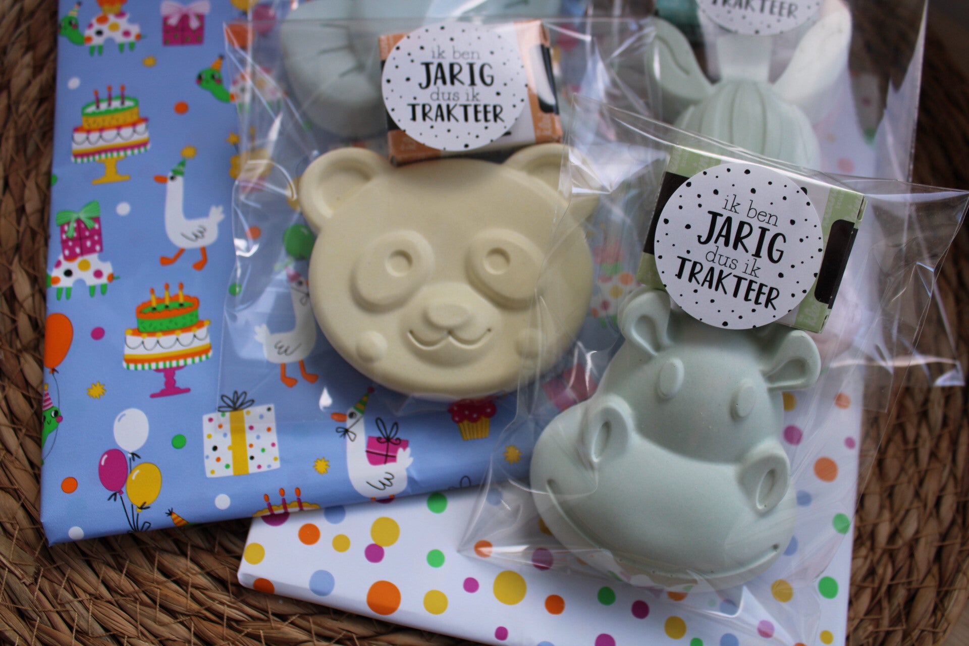 - een stoepkrijt jungle figuur, ongeveer 9cm lang. De kleuren en figuren worden gemixt geleverd. Dus bestaande uit de kleuren roze / blauw / geel en groen, en de figuren: giraf, olifant, nijlpaard, leeuw, zebra en een pandabeer.