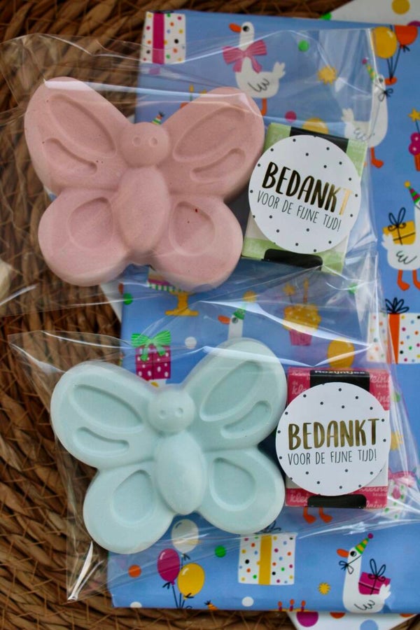 - een stoepkrijt vlinder, ongeveer 8cm lang. De kleuren en figuren worden gemixt geleverd. Dus bestaande uit de kleuren roze / blauw / geel en groen.