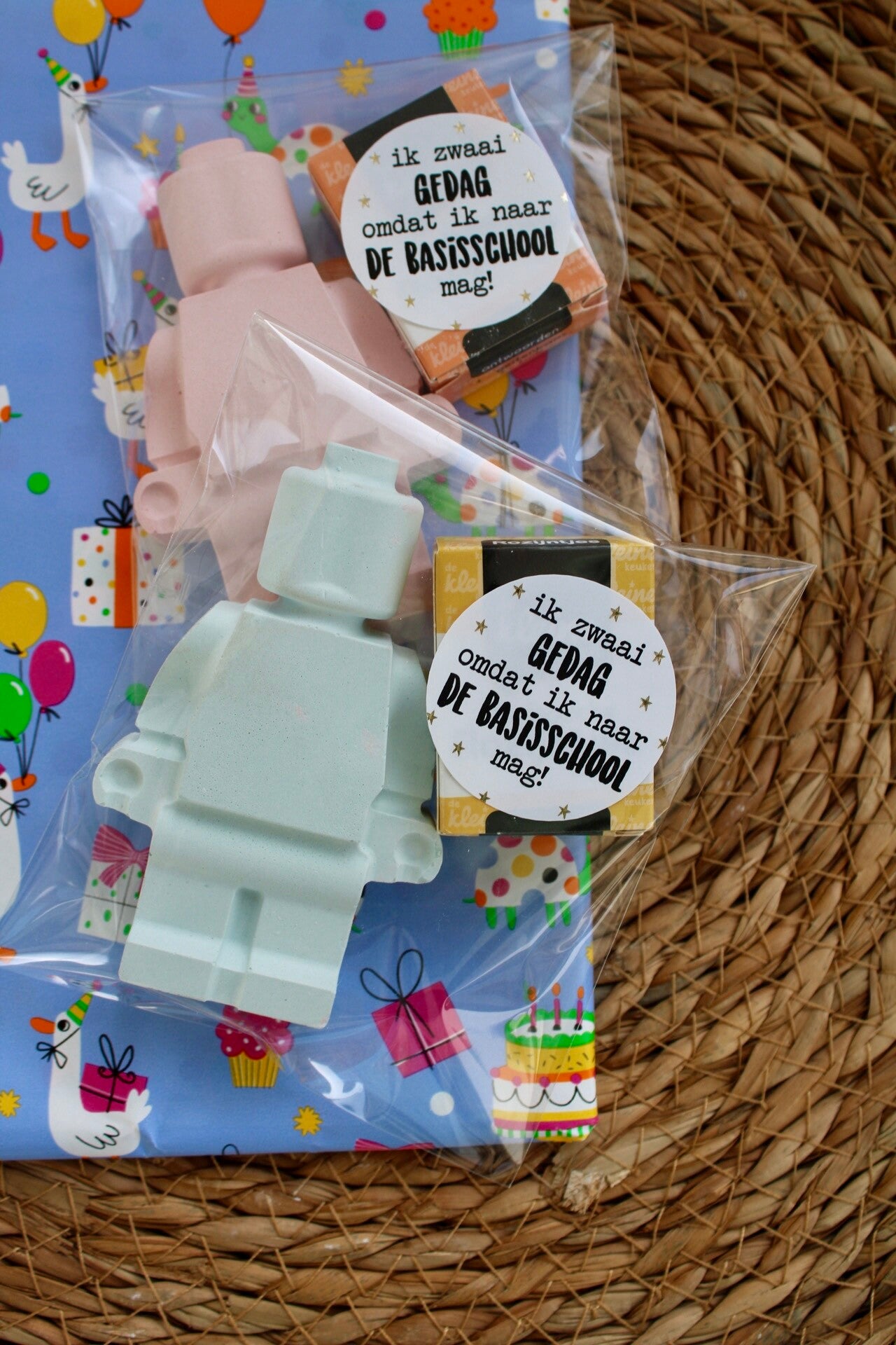 - een stoepkrijt lego poppetje, ongeveer 9 cm lang. De kleuren en figuren worden gemixt geleverd. Dus bestaande uit de kleuren roze / blauw / geel en groen.