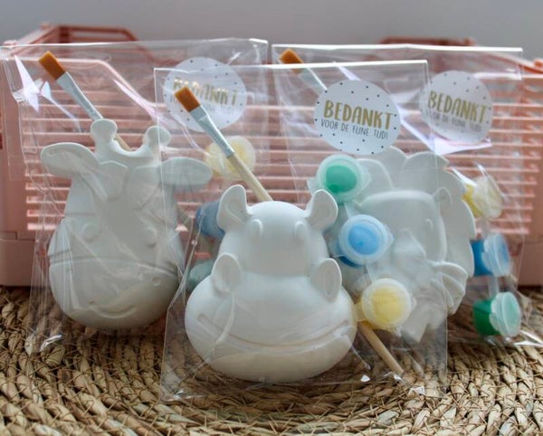 - een stoepkrijt jungle figuur, ongeveer 9cm lang. De figuren worden gemixt gelverd: giraf, olifant, nijlpaard, leeuw, zebra en een pandabeer.